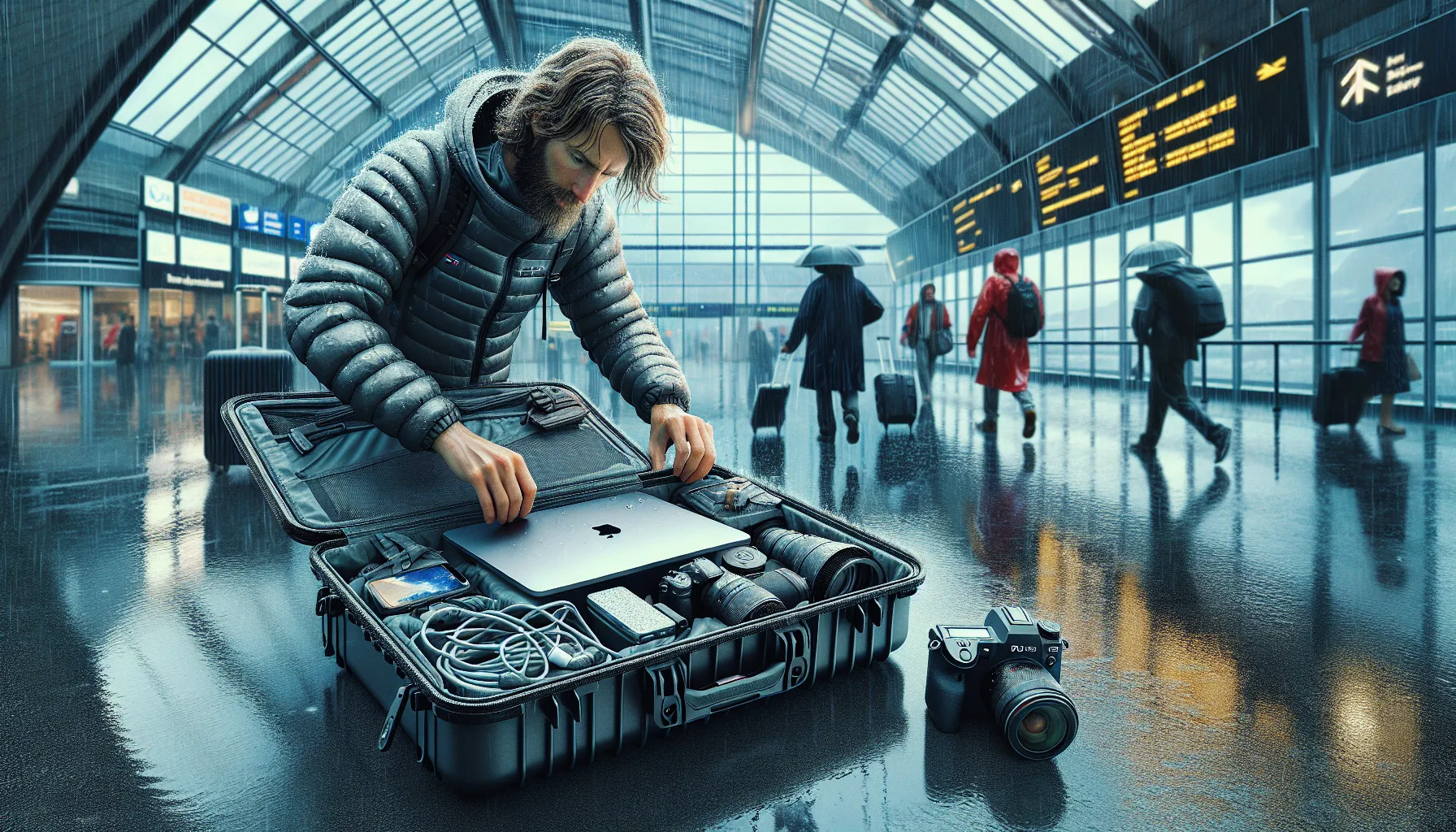 Bruk harde, vanntette etuier og dedikerte organisere for kabler og tilbehør. Polstre hjørner og skjermflater. Hold kabler korte med forsterkede ender. Merk poser tydelig. Oppbevar verdisaker nær kroppen, gjerne i tyverisikre lommer.